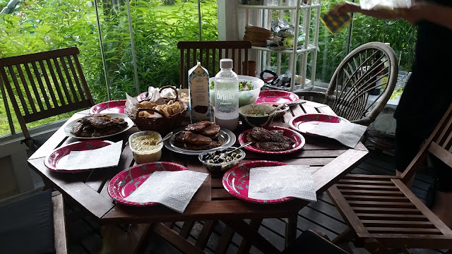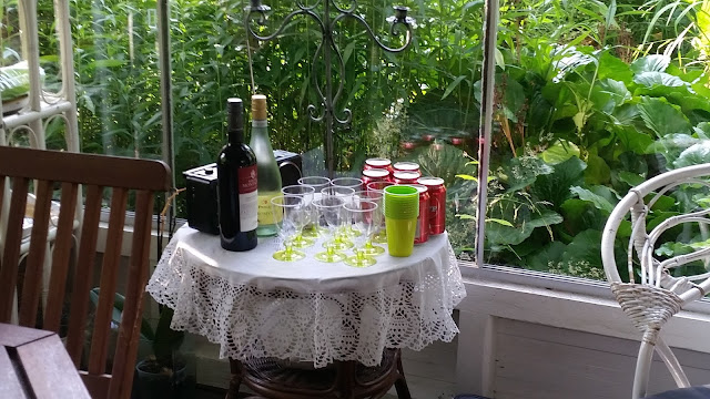 Viime viikonloppuna oltiin T:n kotona grillailemassa ja viettämässä iltaa. Heillä on ihana kesäpesä pihalla, vähän kuin ylimääräinen huone. Syötiin hyvin ja juotiin hyvin ja illan tullen puutarha näytti upealta kynttilöiden ja valojen loisteessa. Mulla ei nyt ollut mukana muuta kun kännykkä, joten kuvat on taas mitä sattuu..